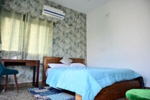 The first floor includes two bedrooms, each with an attached washroom and a private balcony. Guests can enjoy beautiful morning and evening views from the common sitting space, along with stunning front-facing mountain scenery. The terrace above offers a 360° hill view and easy access to a trekking trail just 2 minutes from the property.